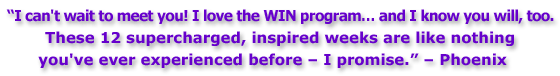 “Amazed with unexpected results” “Every WIN class was full of lessons and new awareness. Phoenix's fresh content and personal, interactive format led to unexpected results in my spiritual growth, fulfillment, awareness, inner stability and job search.